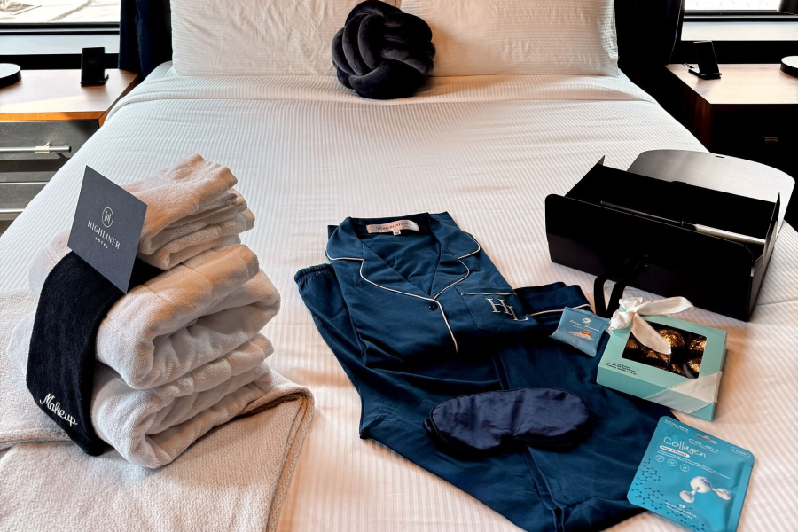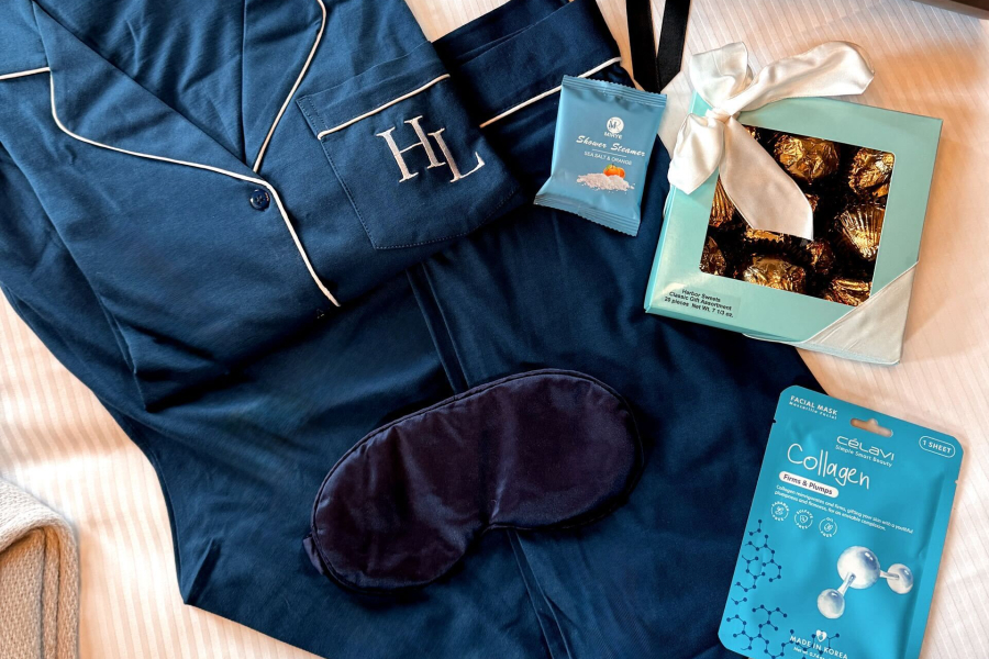 Get cozy in our branded pajamas, enjoy a box of Harbor Sweets chocolates, and unwind with an eye mask, shower steamer, and nourishing face mask.
